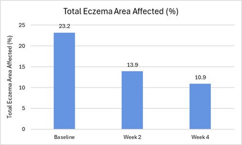 In addition, the mean children’s dermatology life quality index score (CDLQI) improved significantly from 9.3 (moderate effect on child) at baseline, to 3.7 (small effect on child) after 4 weeks.2