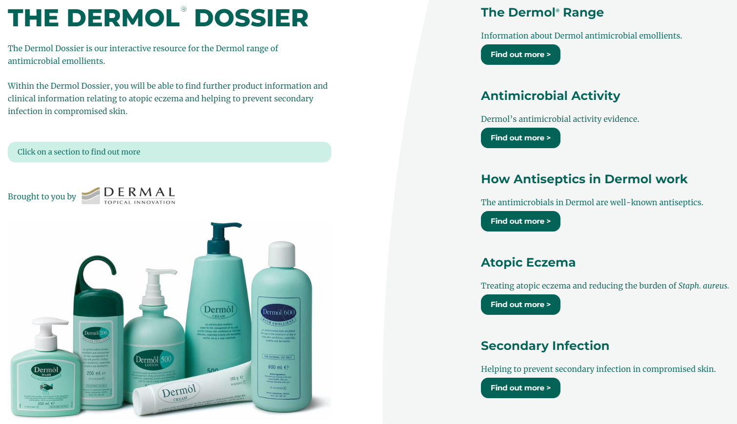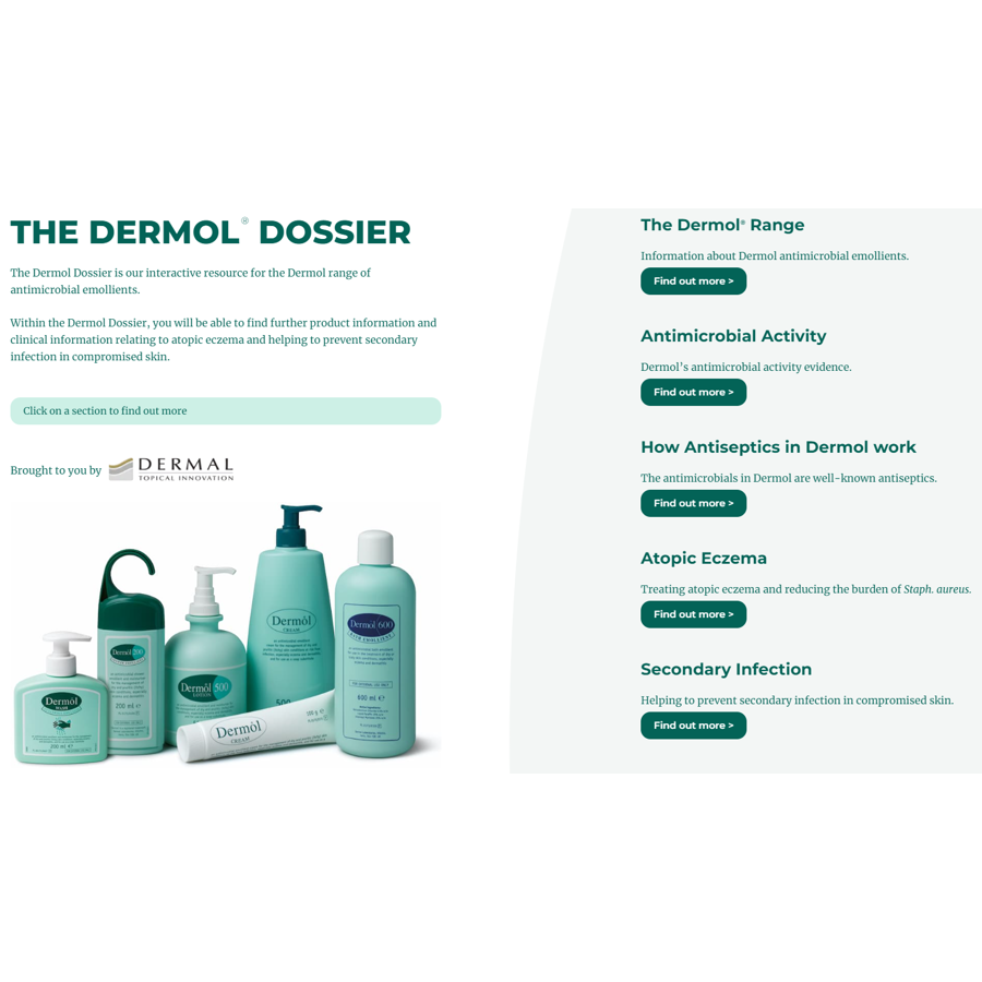 Further information about the Dermol range of antimicrobial emollients and clinical information relating to atopic eczema and dermatitis, skin cleansing, helping to repair compromised skin and preventing secondary infection.