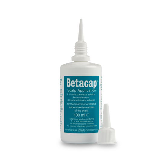 Steroid application containing betamethasone, a potent steroid, which is available only on prescription for the treatment of dermatoses of the scalp, such as psoriasis and seborrhoeic dermatitis.